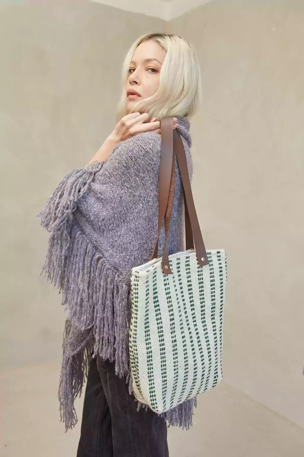 Esta cartera con fuelle se destaca por su diseño rayado vertical y su correa de cuero con remaches color bronce, que le da un toque moderno. Hecha en 100% lana y cuero, ofrece durabilidad y calidad. Cada pieza es tejida a mano por talentosas mujeres argentinas, otorgándole un toque único y artesanal.