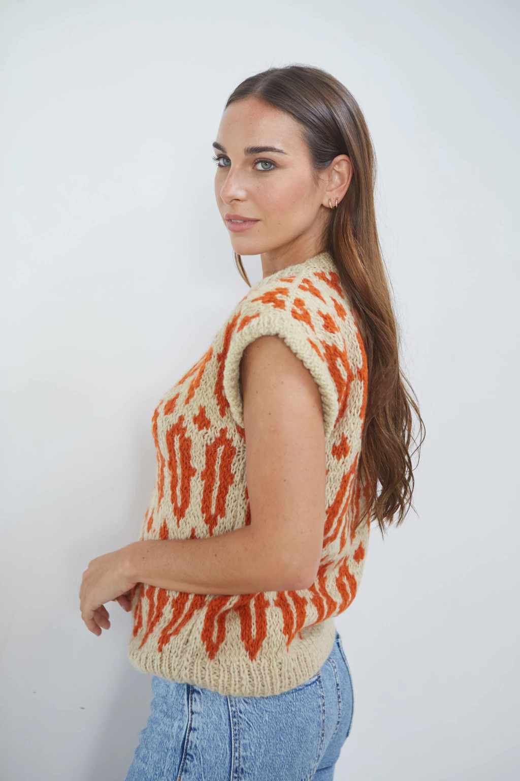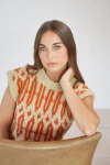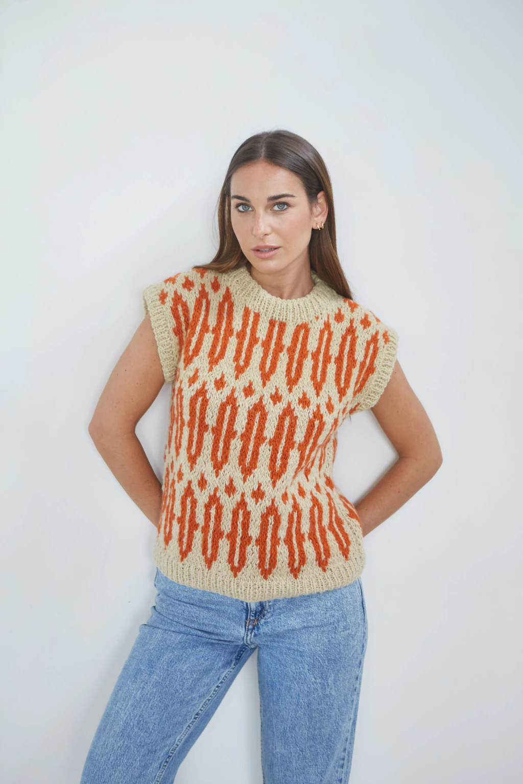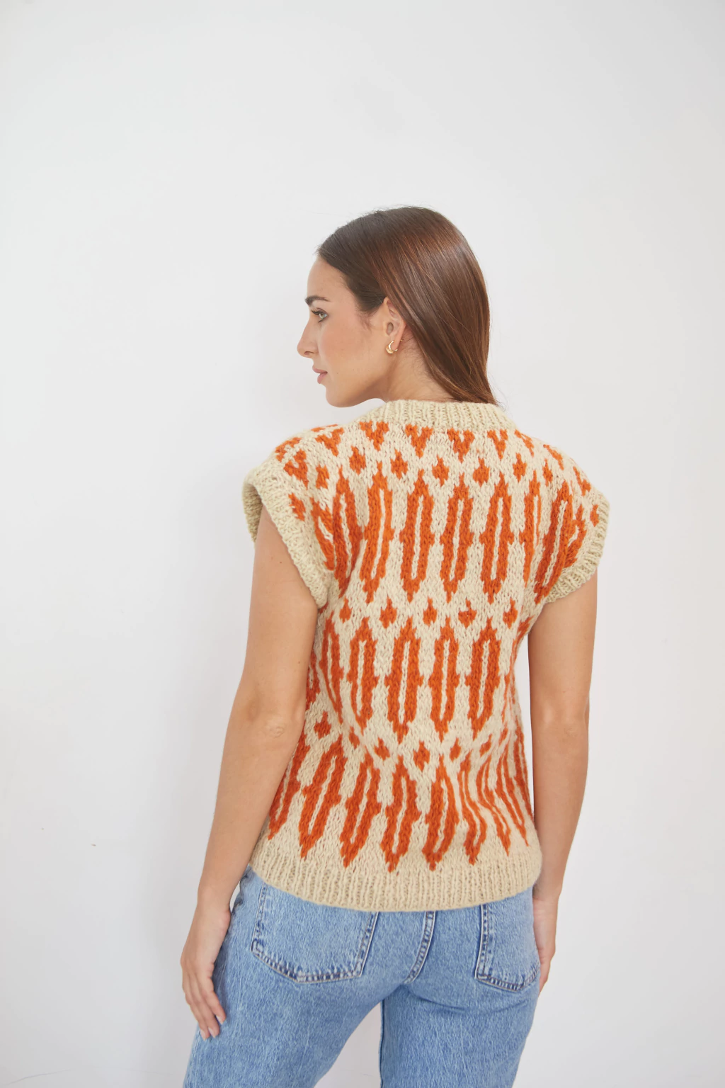 Este chaleco posee un diseño de formas geometricas incorporadas al tejido con cuello redondo. Confeccionado 100% en lana mohair, destaca por su suavidad y ligereza. Cada pieza es tejida a mano por talentosas mujeres argentinas, lo que le otorga un toque único y artesanal.