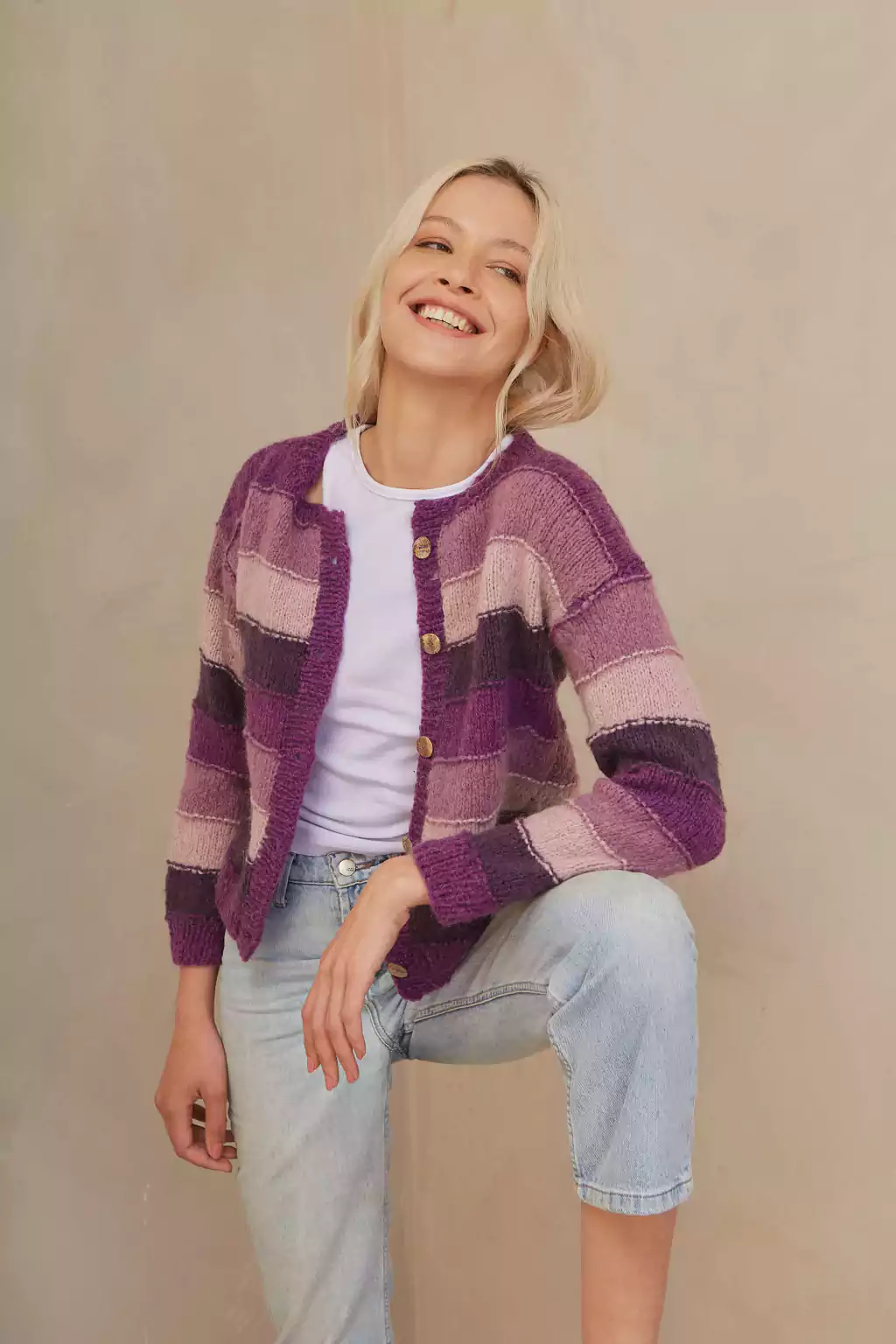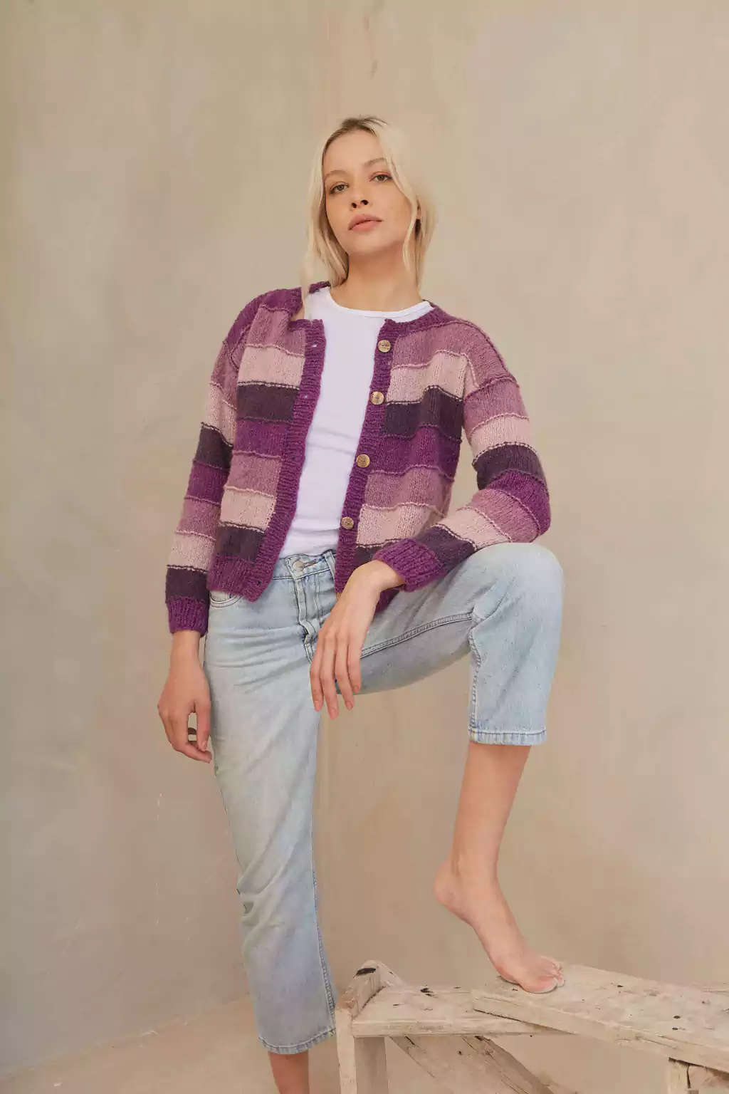 Este saco con botones se distingue por su diseño rayado horizontal en diferentes colores, botones de nacar. Confeccionado en 100% lana mohair, ofrece una suavidad y calidez excepcionales. Cada pieza es tejida a mano por talentosas mujeres argentinas, otorgándole un toque único y artesanal.